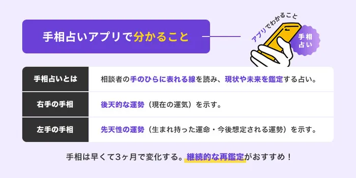「手相占いをもっと気軽に楽しみたい」「対面鑑定は少しハードルが高い」と感じている方にぴったりなのが、手相占いアプリです。