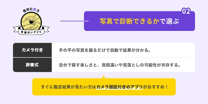 手のひらを撮るだけで手相鑑定ができる、カメラ認証付きか確認しましょう。