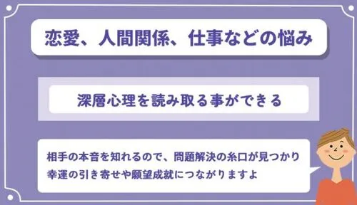 そのため、気になる相手、仲違いしてしまう兄弟姉妹、問題ばかりが起こる職場の人間関係など、相手の本音を知ることで、問題解決のヒントやアドバイスを受け取れます。