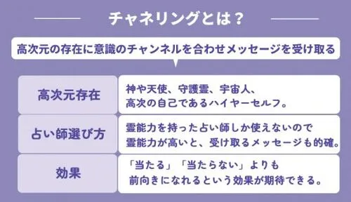 チャネリングは、霊能力を持った占い師しか使えない占術で、占い師は受け取った情報をそのまま相談者に伝えます。