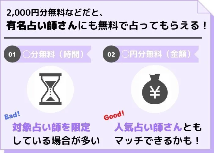 こちらのタイプは対象占い師先生が決まっているものや、対象の占い師さんであれば何人でも無料で受けられるものなど、サイトによって特徴がさまざまです。