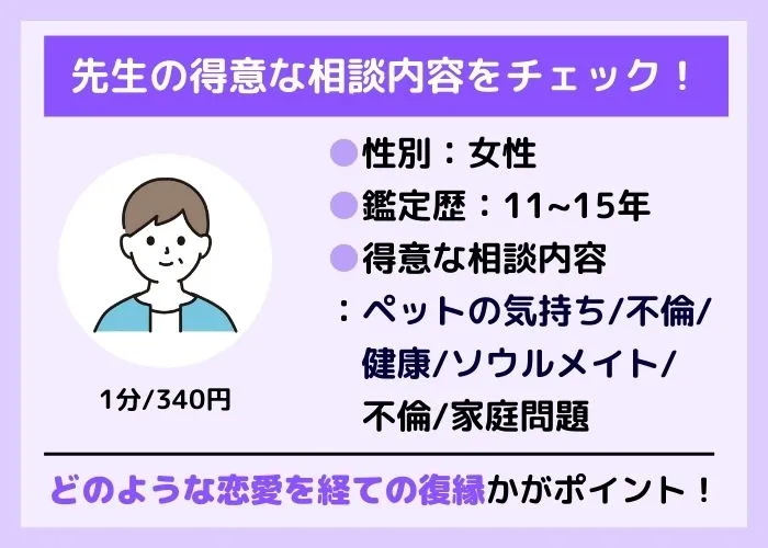 復縁に及ぶまでしてきた恋愛を考え、そのジャンルを得意としている先生を選ぶことでより自分に刺さるアドバイスをもらえますよ。
