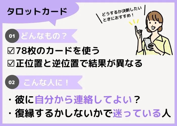 彼へ連絡するかしないかで葛藤しているというように、二択で迷っている場合にはタロットカードによる占いがおすすめ。