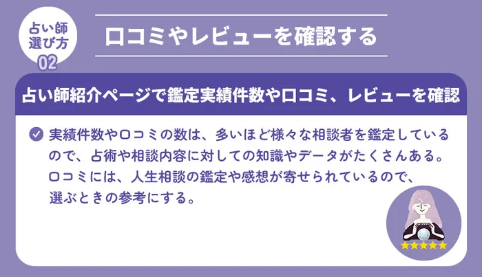鑑定してもらいたい占い師を見つけたら、紹介ページで鑑定実績件数や口コミ、レビューを確認しましょう。