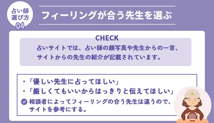 占い師の先生の紹介ページに得意な占術方法が記載されているので、気になる先生を見つけたら必ず確認しましょう。