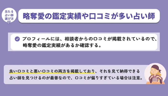 占い師は数多くいるので、ポイントに沿って最適な先生を選びましょう。