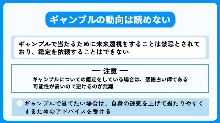 ギャンブルについての鑑定をしている場合は、悪徳占い師である可能性が高いので避けるのが無難です。