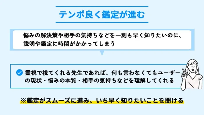 悩みの解決策や相手の気持ちなどを一刻も早く知りたいのに、説明や鑑定に時間がかかるのは不本意でしょう。
