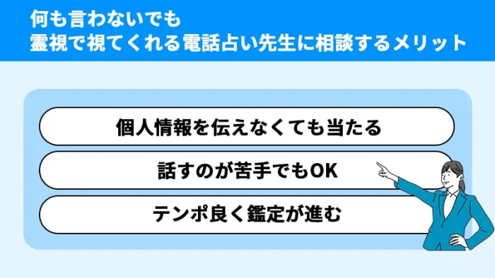 - 4 何も言わないでも霊視で視てくれる電話占い先生に相談するメリット3つ