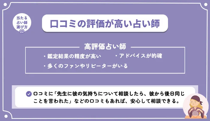 3.「気持ちが当たった」「本音がわかった」などの高評価口コミが多い先生を選ぶ