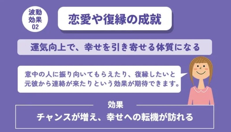 したがって、意中の人に振り向いてもらえたり、復縁したい元彼から連絡が来たりという効果も期待できるでしょう。